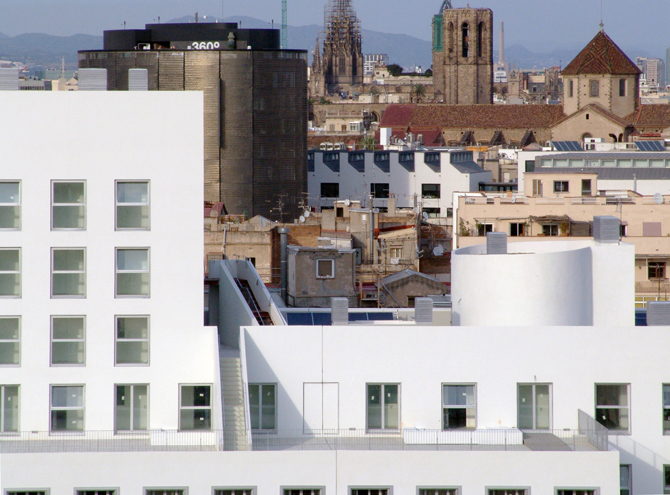 El programa es de viviendas sociales y para personas mayores. También hay un pasaje y un patio comunitario, en las plantas inferiores se ubican los equipamientos públicos. El volumen cumple con dos escalas urbanas diferentes: la primera, la del barrio del Raval: el proyecto crea una pequeña plaza que proporciona una mejor iluminación y ventilación natural a las calles estrechas e incorpora el tradicional balcón y la persiana, que filtran gradualmente una relación de los dominios público y privado; la segunda, el edificio consigue la altura urbana del Eixample.