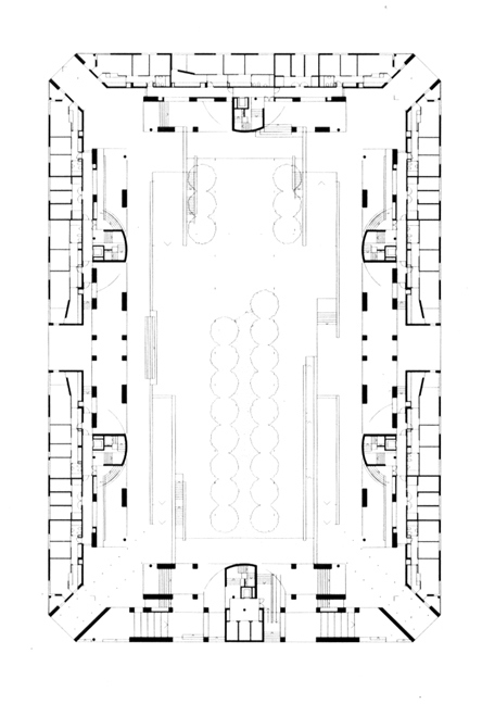 El planeamiento contemplaba la edificación lineal con patio de manzana en un solar rectangular de 90 x 60 m. La ocupación total del área de movimiento fijado en el planeamiento, añadido a la altura permitida, arrojaba una edificabilidad que las 131 viviendas obligadas no consumían. Podía optarse por ocupar toda el área con menos altura de la permitida o consumir esta, liberando parte del suelo, consiguiendo, así, accesos al interior del patio de manzana.