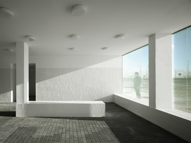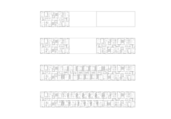Para una misma edificabilidad reducir la huella del edificio implica necesariamente crecer en altura. Aun siendo todas las viviendas de 1 y 2 dormitorios, las de menor dimensión se sitúan en los elementos en altura y se desarrollan en una sola planta, mientras que los dúplex, como repetición de unidades funcionalmente indiferenciadas, ocupan el desarrollo longitudinal del zócalo. Las viviendas en dúplex se componen de dos estancias versátiles que se cruzan en sección para disfrutar de las orientaciones norte y sur.