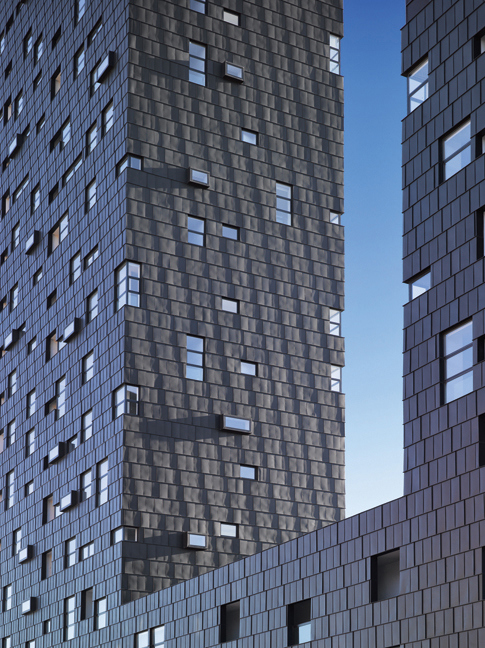 El cerramiento exterior recurre a los recursos de indiferenciación y ambigüedad escalar. Se trata de una piel de escamas de zinc en franjas horizontales que deslizan unas sobre otras con un ligero decalaje y en las que se insertan los huecos con la intención de no hacer evidentes los niveles de piso. Se plantea un sistema combinatorio de huecos tipo de reconocible corte doméstico que encuentran su mejor posición siempre desde dentro de las estancias. Constructivamente, la fachada de zinc se convierte en el argumento central, no solo por cuestiones de su ejecución material, sino también como estrategia de eficiencia energética.
