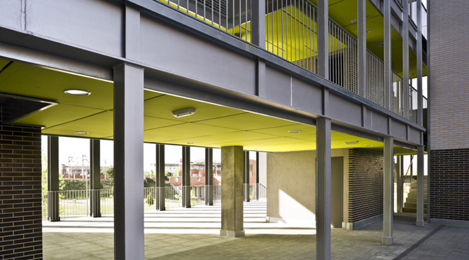 La edificación concentrada al sureste de la parcela permite situar un volumen más icónico que le aporta identidad al conjunto. Esta pieza troquelada se sitúa paralela al trazado del ferrocarril con vistas sobre el casco urbano de Alcorcón. Una vivienda pequeña no es una reducción dimensional de una mayor. Sus dimensiones determinan un nuevo tipo, esencialmente distinto de la vivienda convencional de protección pública.