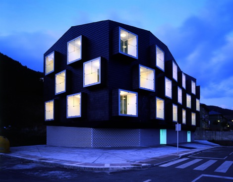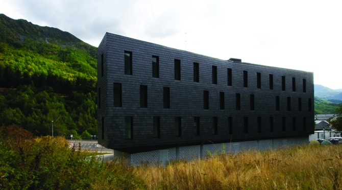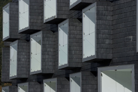 El proyecto tuvo dos etapas, que se materializaron en dos edificios perpendiculares formando una “L”. En la primera etapa consideramos el edificio más grande, el que enfrenta la calle que cruza la ciudad. El volumen que proponemos tiene una forma angular. Es una geometría cristalizada que deriva de algunas leyes elementales que están dadas por las regulaciones de la ciudad. El resultado formal es algo entre un objeto petrificado, una forma de montaña y un organismo flotante sobre la ladera de la montaña. Este objeto “cristalográfico” tiene el mismo color oscuro que la pizarra del lugar. Como un pedazo de carbón, absorbe casi toda la luz que recibe y refleja una pequeña cantidad de esta, mostrando calmadamente su rica geometría.