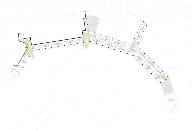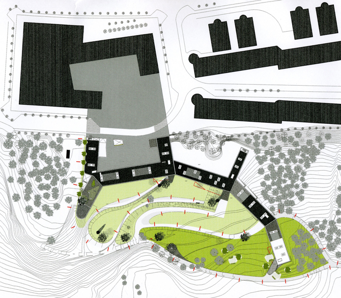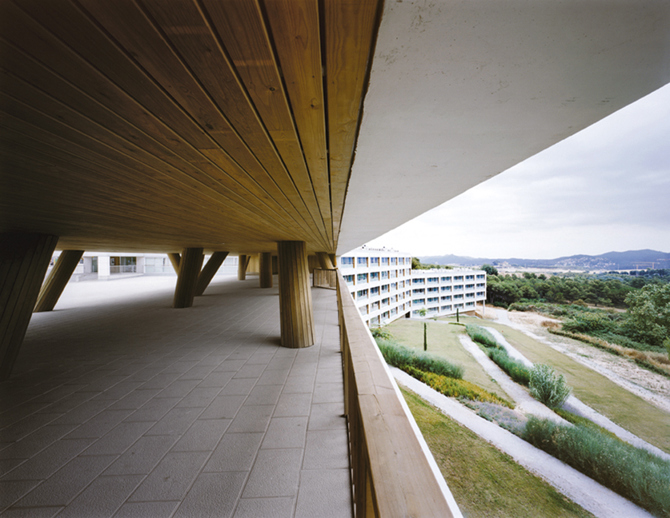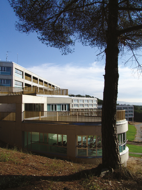 Atendiendo a este hecho determinante, el edificio procura culminar la implantación urbana de la residencia preexistente, configurando una plaza que debe convertirse en el centro cívico del conjunto, al mismo tiempo que se vuelca y abraza el valle de Sant Domènec. La tipología básica –pasillo y habitaciones– se pliega en diversas formas para ejecutar este doble papel, ajustándose al tiempo, a la topografía y a la vegetación (no se ha tocado ningún árbol).