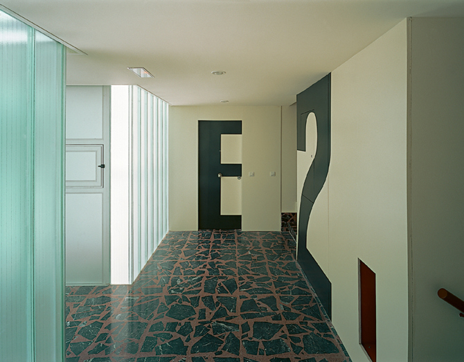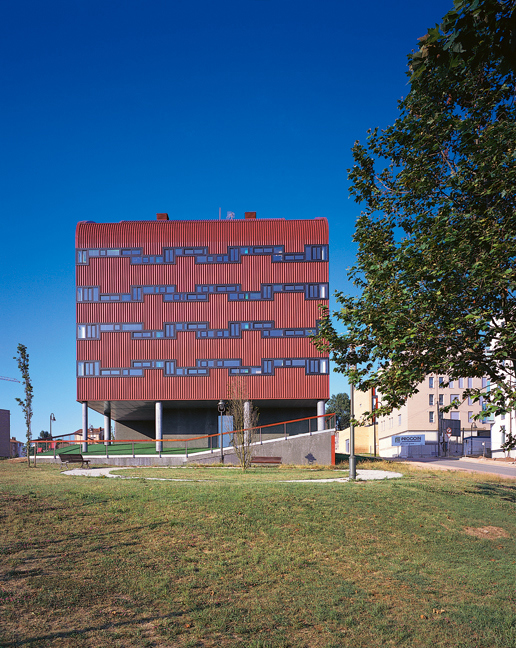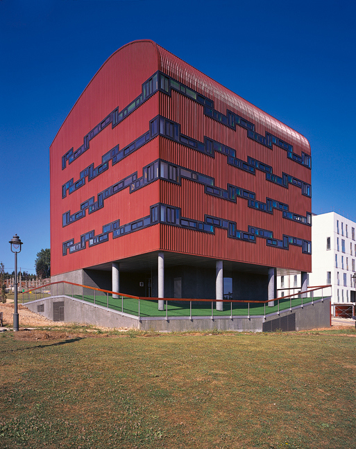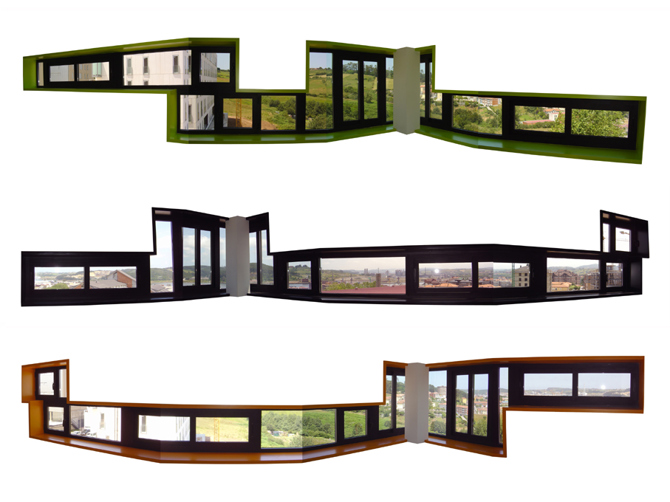 La volumetría única y continua se construye con una chapa de acero sobre fábrica, aislamiento continuo y cámara ventilada. Los huecos dibujan sobre la chapa un troquelado continuo que sobresale ligeramente del plano de la fachada. El falso techo de planta baja, entendido como plano de contacto con las laderas artificiales, se licúa elevando el volumen construido. Los pilares que sostienen este volumen tienen diferentes secciones y alturas. Los espacios intermedios, entre la vivienda y el exterior, son personalizados y especificados de forma que expresen el valor de este espacio público cercano a la vivienda. Se utiliza un terrazo con china de rechazo y una señalética escalada.