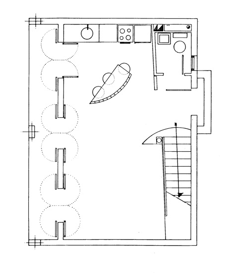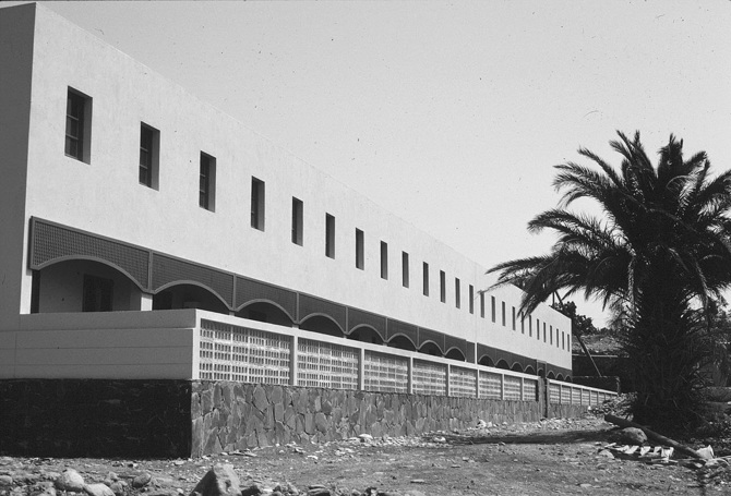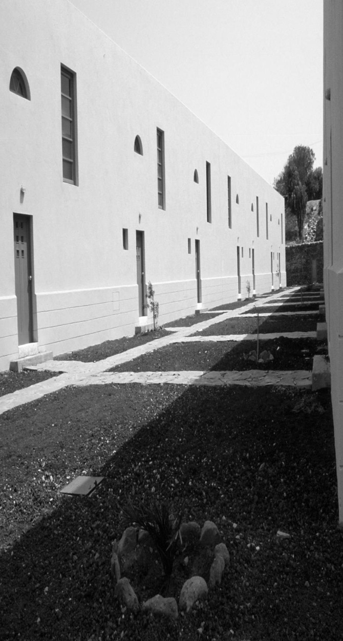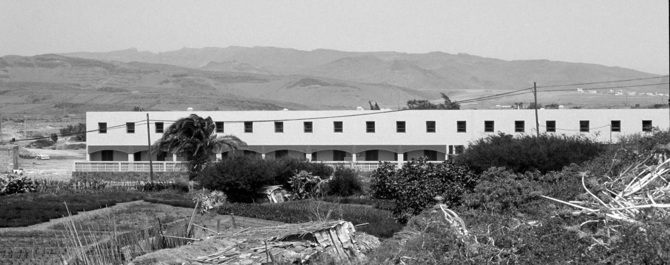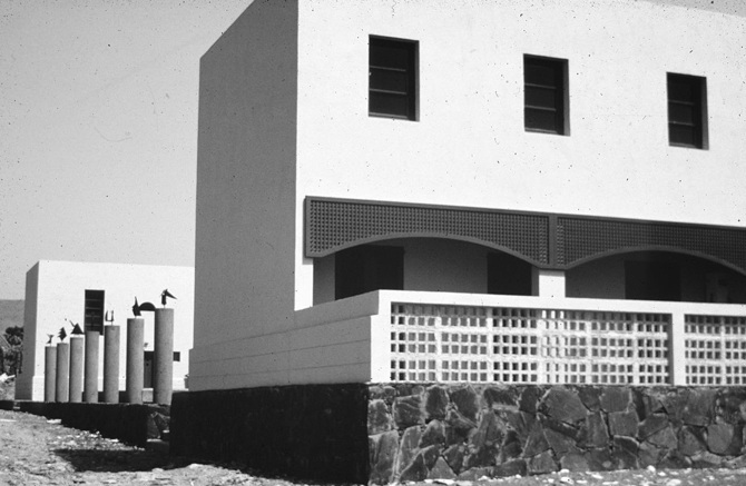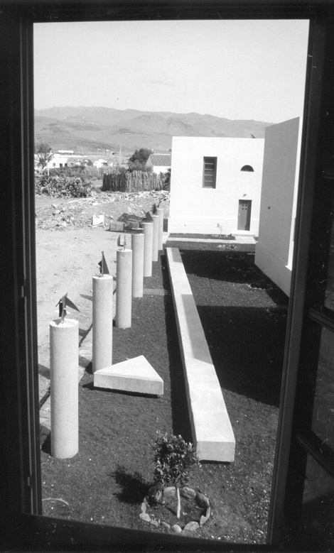 El lugar no estaba urbanizado, sin calles, solo desierto alrededor, se sentía el silencio del sur profundo. Un podium de lajas marcó el lugar, los jardines se cercaron con los cortavientos utilizados en las plataneras. Los bloques sufren un ligero desplazamiento, para que el espacio fluya, para que no fuese estático.