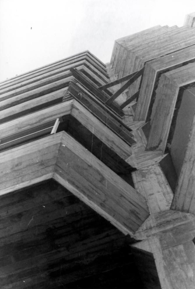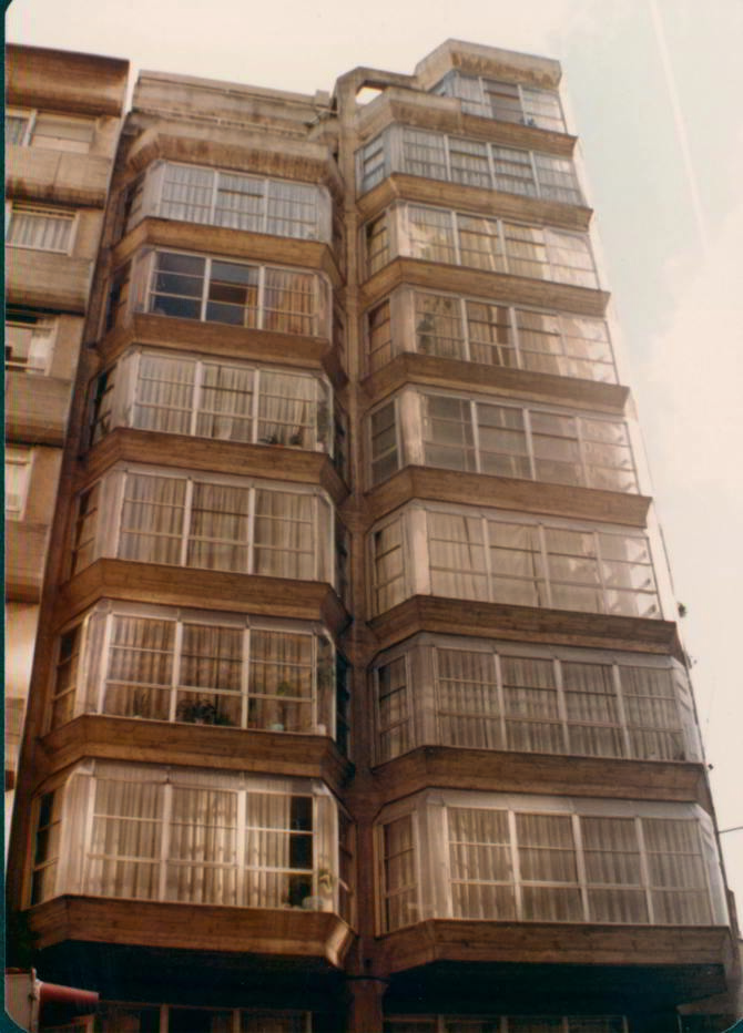 El aspecto exterior trata de enlazar con el de esta zona del ensanche, en la que es frecuente el mirador achaflanado. Se utiliza una pantalla de hormigón visto, cuya sección vertical es un semi-hexágono, el cual va permitiendo en las estancias la luz cenital. La carpintería exterior es de aluminio. La parte de medianería que resulta por la calle de Fernando González lleva el mismo tratamiento.