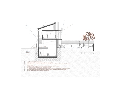 La protección de las viviendas reacciona a la oscilación climática, más de 50 ºC entre estaciones. Esta respuesta, basada en la interpretación de la arquitectura vernácula, pretende conseguir la adaptación de estas casas al medio, cual especies vegetales. Las indagaciones principales han transformado el muro grueso masivo de la casa tradicional en un muro multicapa que evita los puentes térmicos. Esta condición se ha mantenido también para los huecos, con doble carpintería abatible, conformando un total de tres cámaras y siete hojas en disposición asimétrica.