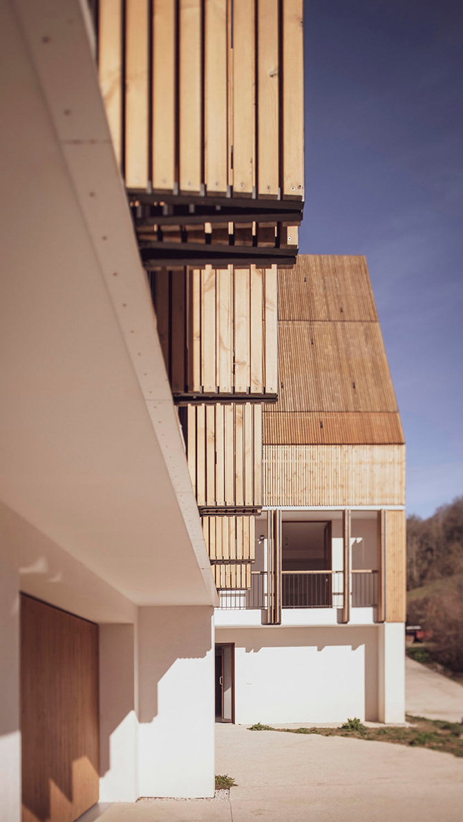 Además, las viviendas se diseñan con criterios de máxima flexibilidad favoreciendo distintos modos de habitar. La estructura de madera contralaminada se limita a fachada y particiones con elementos comunes, favoreciendo las transformaciones interiores. Todas las viviendas son accesibles para habitantes con movilidad reducida, y se han diseñado con criterios sostenibles (estándar Passivhaus). El tamaño de huecos de iluminación y el uso de amplias terrazas, permiten además una vinculación con el paisaje desde el interior, reforzando el sentimiento de pertenencia al lugar, además de mejorar la calidad de vida que otorgan las viviendas.