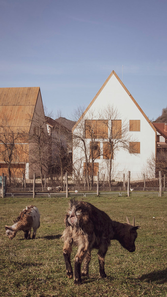 Tras el análisis de los arquetípicos del caserío tradicional vasco-navarro se decide dividir el programa requerido en dos volúmenes, con cubiertas de gran pendiente, y dispuestos en direcciones opuestas para favorecer el diálogo con su entorno. Además, la elección de los materiales es sensible al lugar, recurriendo a materiales típicos como el mortero blanco en fachadas y la madera en cubiertas y contraventanas, recuperando y reinterpretando el uso de la teja de madera típico de la zona. El acabado de cubierta y de las contraventanas de las galerías se dispone en continuidad dotando de identidad propia a la propuesta. Esta reinterpretación del arquetipo del caserío permite la vinculación de la propuesta con la memoria colectiva del lugar.