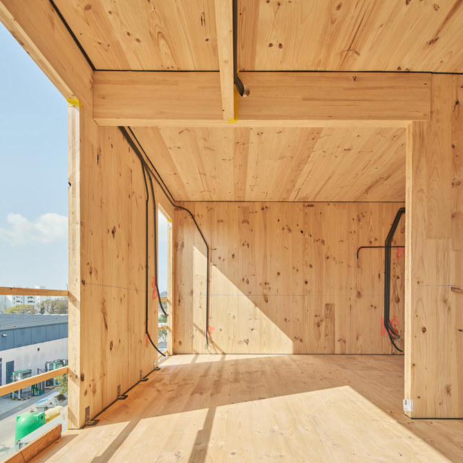 Unas plantas bajas pesadas que protegen la estructura de madera de posibles humedades mientras que las superiores son ligeras y de construcción en seco reduciendo los tiempos de obra y el peso del edificio.