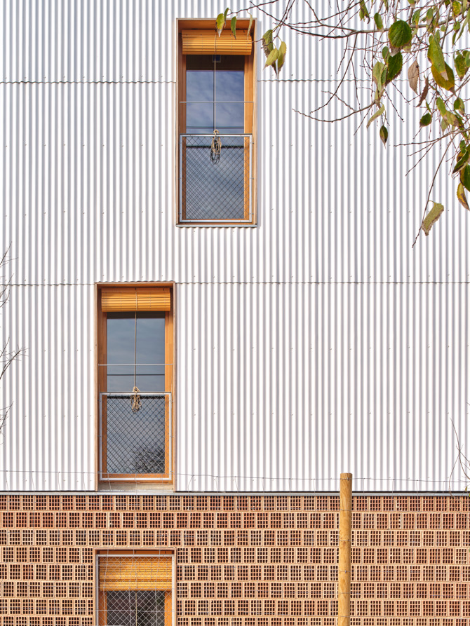 Las plantas bajas se componen por una doble hoja de ladrillo cerámico de fabricación local, colocando la hoja exterior de perfil para facilitar la ventilación., mientras que las plantas superiores se componen por una fachada ventilada de placas de fibrocemento color blanco tintado en masa colocado sobre rastreles.