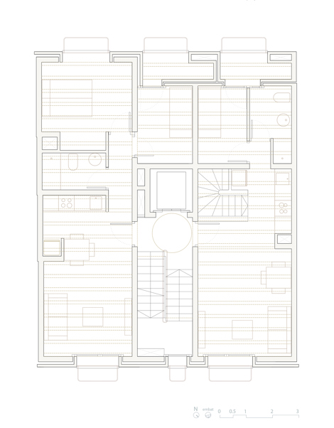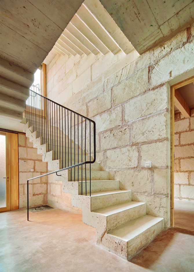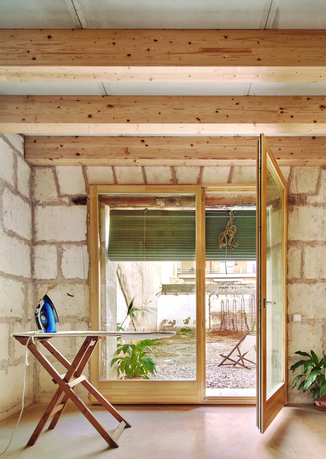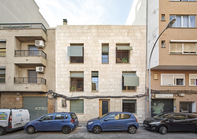 El proyecto recupera y visibiliza uno de los mejores rasgos del barrio: las pequeñas casas entre medianeras construidas con piedras de marès, y que revelan el mapa de recursos del lugar, que vuelve a ser viable económicamente en el siglo XXI gracias a los requerimientos térmicos y acústicos del CTE y las diferentes directivas europeas: la emergencia climática hace que sea posible volver a utilizar aquellos sistemas que habrían evitado dicha crisis climática. El edificio es de clase energética A, y la producción de ACS se realiza mediante bombas de aerotermia colectivas ubicadas en la cubierta, apoyadas por una batería de paneles fotovoltaicos.