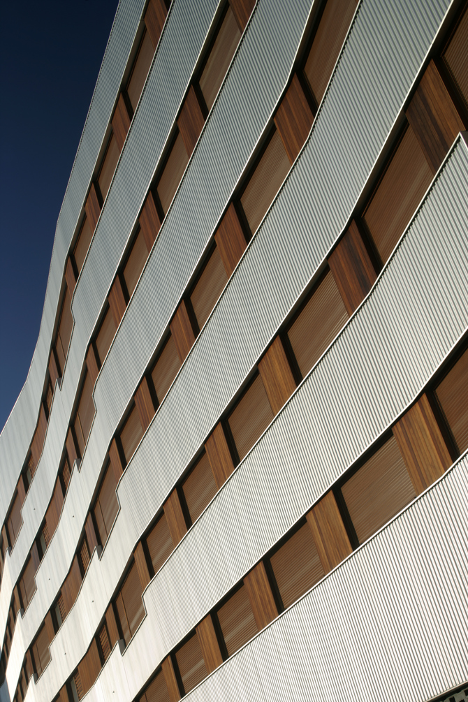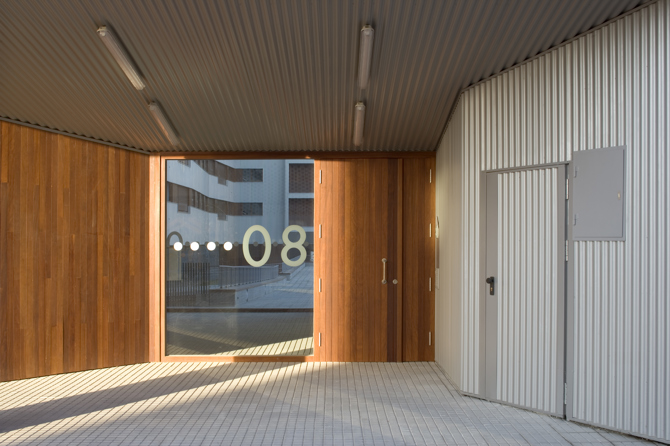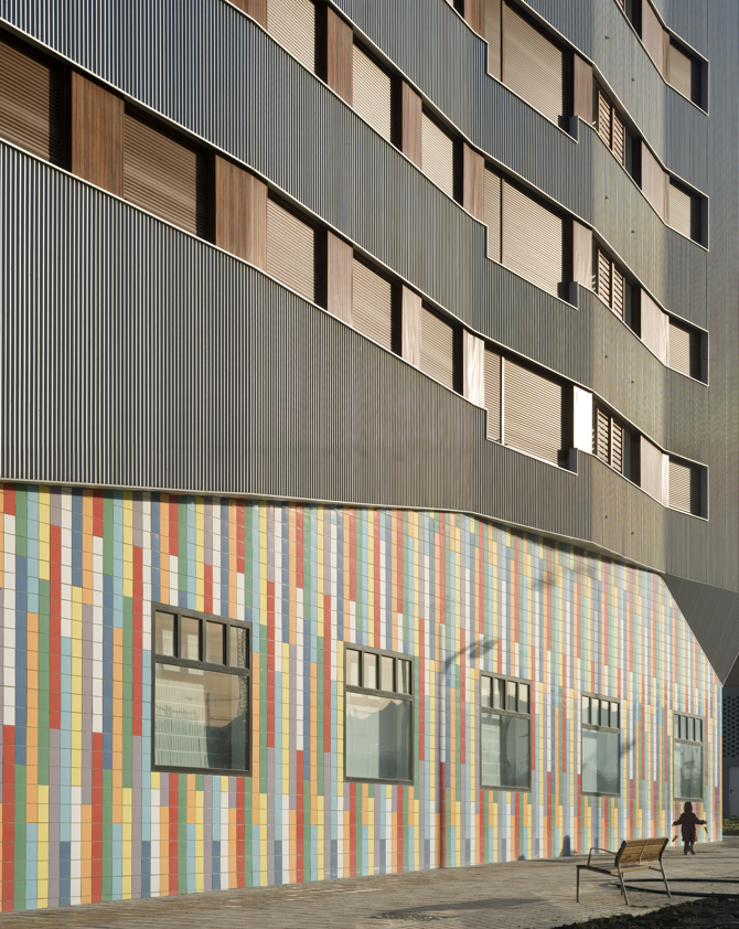 La estricta regulación de la volumetría del bloque impuesta en el planeamiento se altera según las condiciones de su entorno; de esta manera el edificio se muestra vivo y sensible a las condiciones de su entorno. El bloque, metálico, se deforma mostrándose duro y recto, recogiendo sus cubiertas al norte, vibrando al este y al oeste al reflejo de la luz rasante y a la calle más dura y abriéndose al sur con terrazas de madera, que pretenden dar un contrapunto cálido a la dureza del metal.