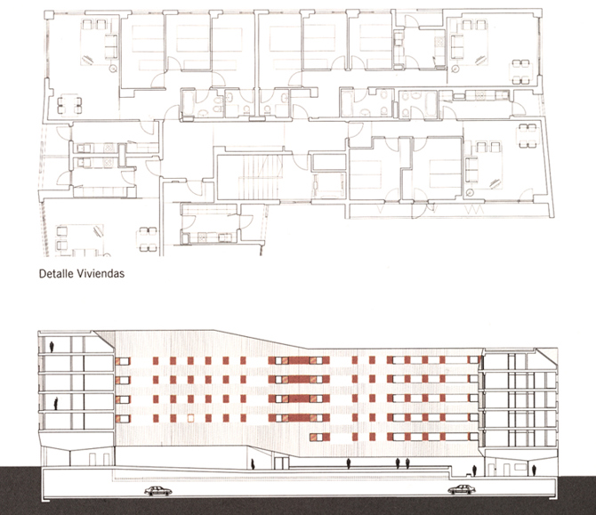 El tratamiento formal no responde a la voluntad del planeamiento de volcar el bloque en forma de “U” a un espacio interior sino a la orientación de cada fachada. Funciones desarrolladas: