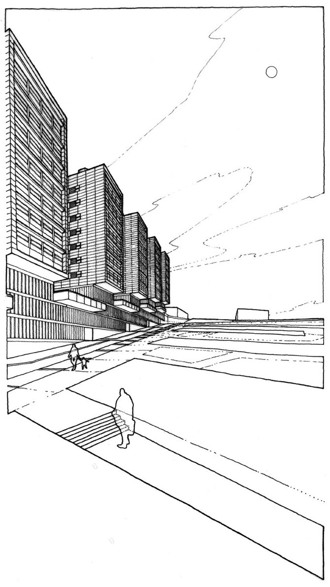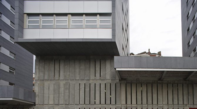 La geometría establecida para la planta de las torres predeterminaba la posición de los núcleos de comunicación vertical y una disposición de viviendas en crujías de 4'5 m con poco margen para el ensayo. Por este motivo, el interés del proyecto se ha centrado en darle expresión a la envolvente constructiva y el carácter de los espacios públicos. El gran zócalo de aparcamiento, que aloja 267 plazas, se ha planteado como una fachada semiabierta construida con grandes piezas de hormigón prefabricado de color grafito en celosía. Las torres se expresan como elementos autónomos que descansan directamente sobre este zócalo.