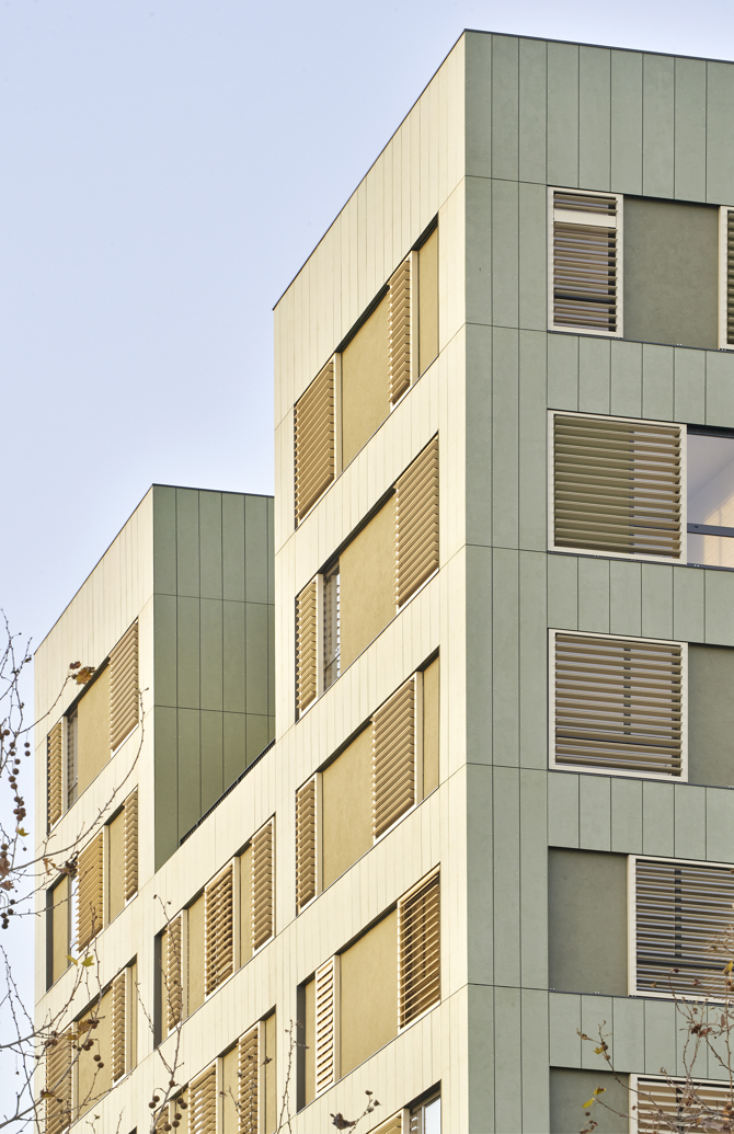 Las fachadas exteriores son repetitivas y cerradas mediante lámina de panel industrial exterior ventilado a la búsqueda de una imagen rotunda y monumental del volumen afortunadamente rodeado de espacio público. En contraste, las fachadas de los patios y corredores tienen un carácter cuasi pintoresco con celosías, alicatados y pavimentos de baldosa cerámica de amplia tradición en Cataluña.