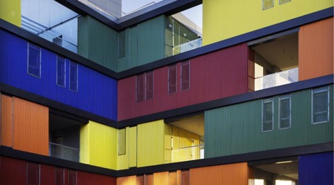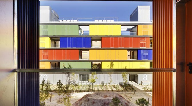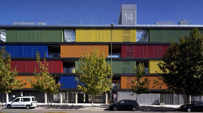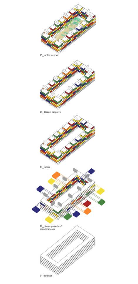 La organización del bloque de viviendas se obtiene desde la voluntad conceptual de aplicación de un sencillo mecanismo de agrupación lineal y ordenada sobre una bandeja estructural de hormigón armado previamente construida; esa misma agrupación se produce en altura, desde la más estricta literalidad, provocando una lectura de contenidos mecánicos: cada una de esas células habitadas tendrían la necesidad de ser asumidas por la industria y transportadas de manera natural a sus bandejas de apilación y conectadas con las distintas redes de suministro y evacuación.