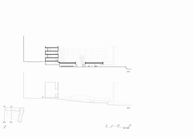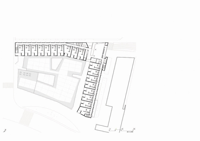 - El vacío topográfico se resuelve con el aparcamiento y el volumen del centro cívico. Su cubierta se entiende como una quinta fachada del edificio. Está tratada con un acabado pintado en forma de tenis, similar al pavimento deportivo utilizado en la urbanización del parque cercano. Está completamente abierto en planta baja mostrando su carácter público a la calle actuando como un verdadero generador de actividad para el entorno