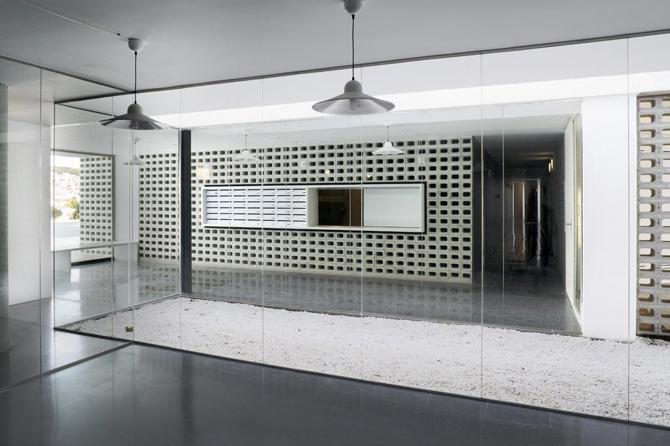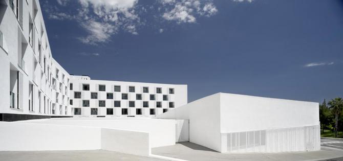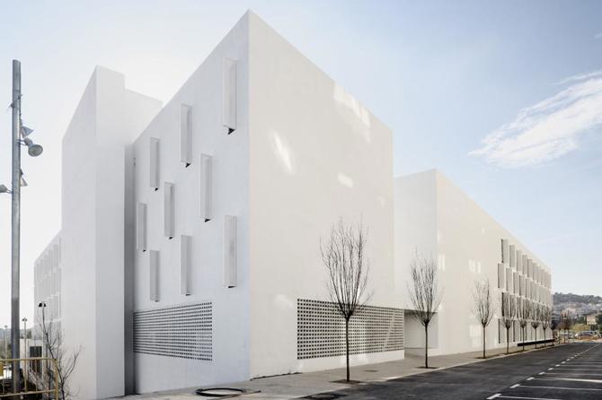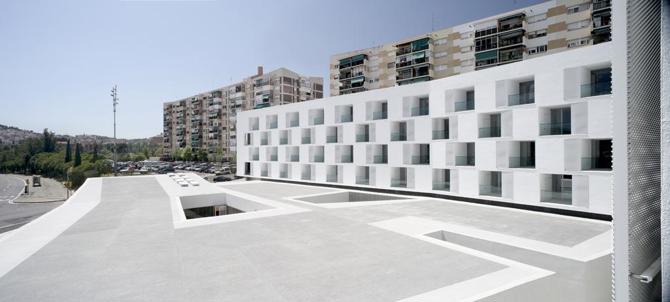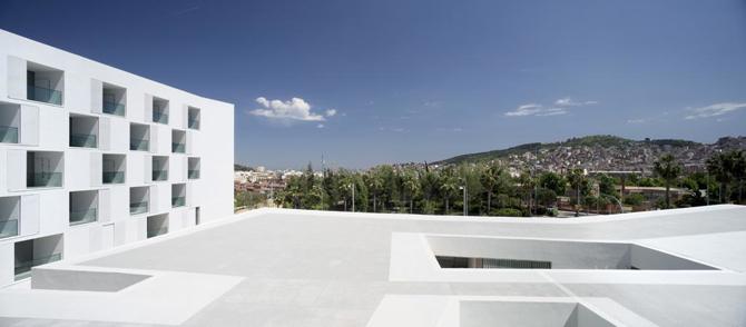 - Contención económica. El blanco y el vacío son los únicos materiales utilizados para la composición de la fachada. Aprovechando las benévolas condiciones climáticas mediterráneas las terrazas funcionan como condensadores de actividad potenciando el sentido de comunidad de los usuarios. Es el lugar donde se desarrollan las actividades domésticas y cívicas y se muestran a la ciudad. Son como el patio central de las casas de la kasbah argelina pero situadas en un plano vertical. El tamaño (2,5 x 2,5 x 2,5) de esos vacíos supera la escala de las viviendas y habla en un nivel más cercano a la escala del edificio y de la ciudad. El conjunto de todas esas acciones y actividades diferentes se integra en el volumen del edificio debido a la posición interior de la terraza. La repetición del vacío convierte la fachada en una textura de ajedrez. El fondo blanco lo unifica todo al igual que la nieve caída en el paisaje.