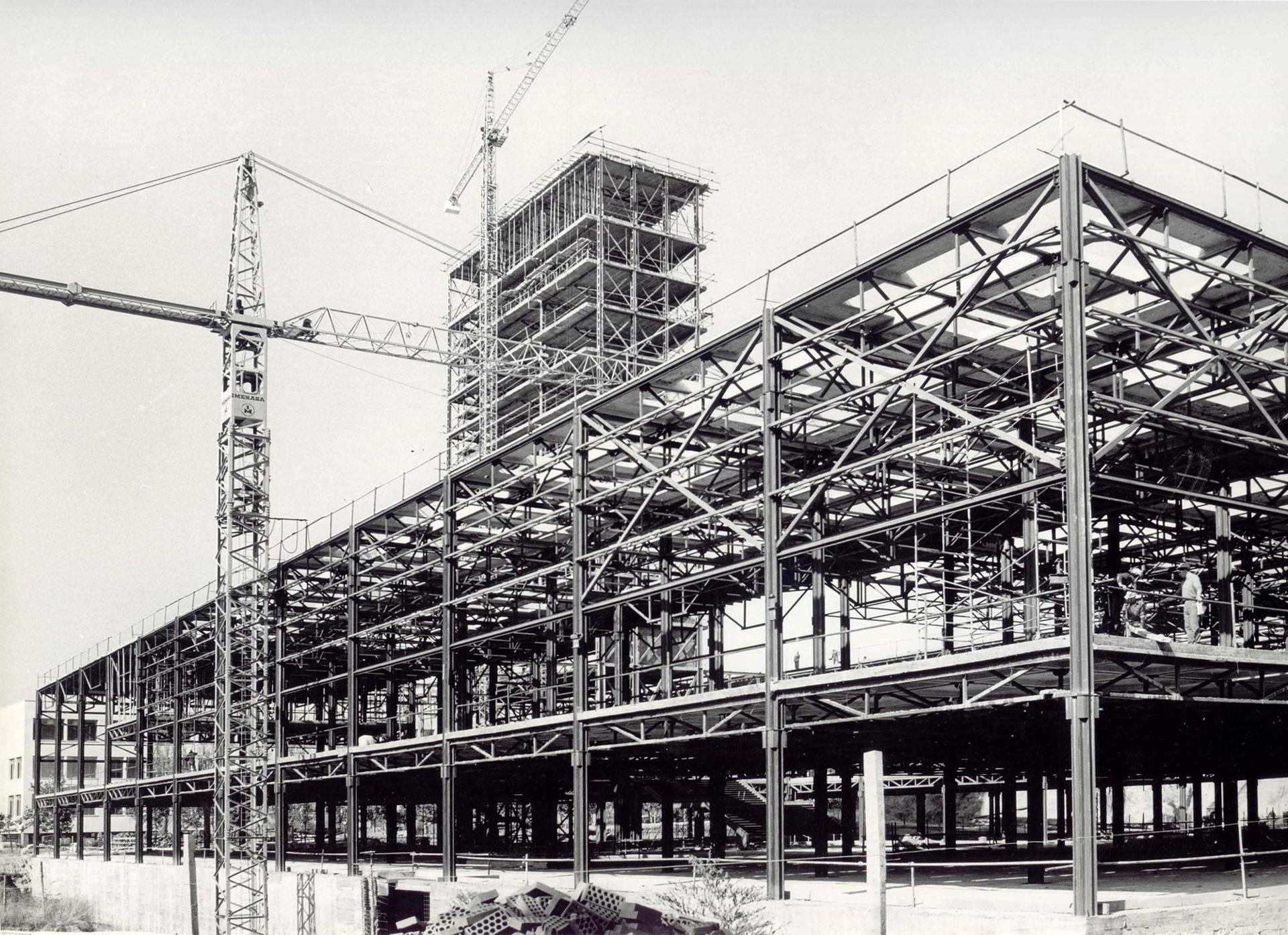 Fijémonos por un momento en la siguiente fotografía, tomada durante la construcción del Museo Español de Arte Contemporáneo alrededor del año 1972. Se trata de una instantánea que retrata un colosal esqueleto metálico, formado por un sinfín de elementos lineales que, organizados en pilares, vigas, cerchas y cruces, se repiten para cubrir un espacio aligerado. La aparente complejidad de la estructura contrasta con la poca mano de obra: apenas una decena de trabajadores se adivinan en la imagen, además de las dos grúas que han utilizado para levantar el esqueleto. No es descabellado pensarlo; al fin y al cabo, el acero era ya entonces un material altamente industrializado que permitía estructuras de rápida ejecución y que, gracias a sus extraordinarias capacidades resistentes, podían reducirse al mínimo para maximizar la entrada de aire y luz natural.
