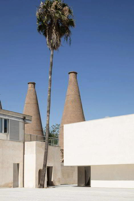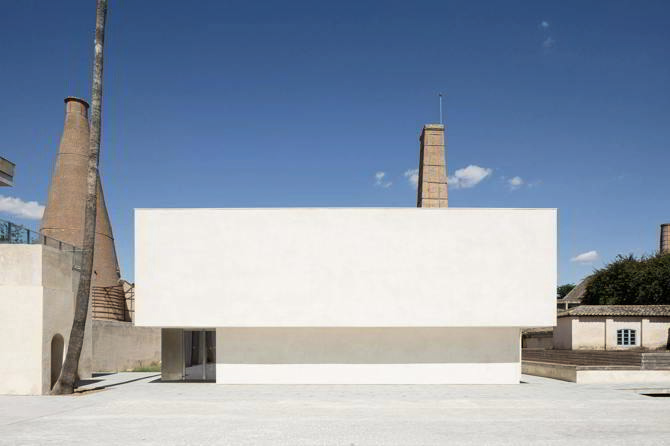 El nuevo pabellón se presenta como un elemento de articulación entre los distintos ámbitos que el plano de suelo dibuja. Se proyecta un volumen prismático de sencilla geometría que se relaciona en escala y materialidad con los edificios existentes, ocupando en planta una posición central en recuerdo del muro que en origen delimitaba el frente oriental del Claustro de Legos. Su sección se escalona para esbozar un paso a cubierto, como reflejo de la arquería o deambulatorio que aún se conserva en el frente occidental. Un gesto que dirige la atención hacia sus extremos menores, norte y sur donde, en un segundo plano, se ubican los accesos y los huecos que registran el espacio interior. El acceso de grandes piezas al pabellón se resuelve en su frente norte mediante una puerta acristalada que introduce el perfil del Monasterio y la secuencia de grandes chimeneas de botella de la Fábrica Pickman. En el interior, la sala recibe una iluminación natural permanente y regulable, tanto cenitalmente como a través de otros huecos menores dispuestos estratégicamente para permitir el intercambio de miradas con las celdas de legos y otras preexistencias fabriles.