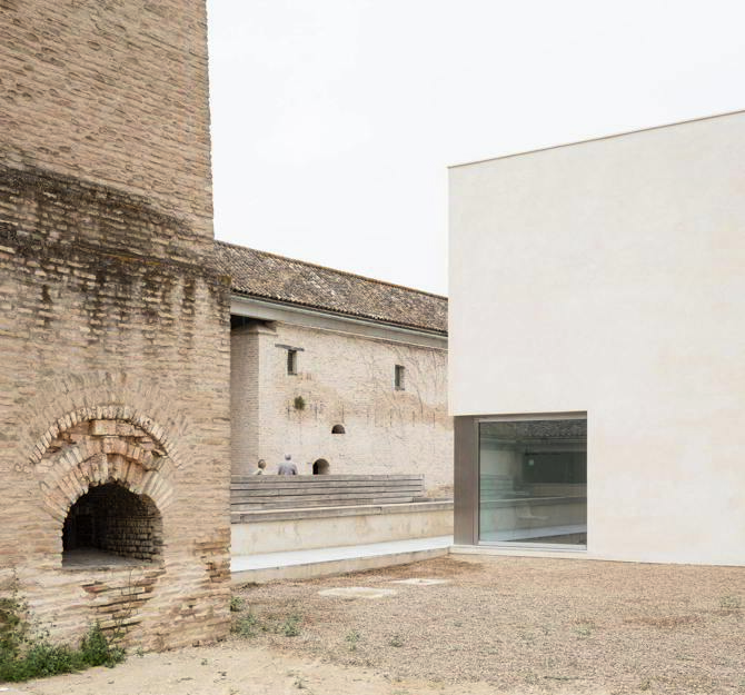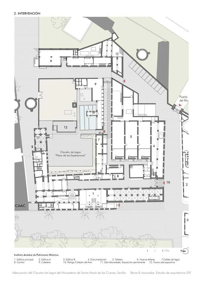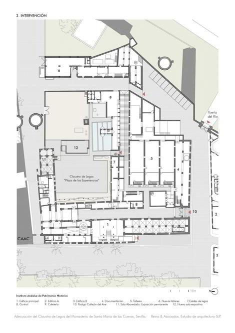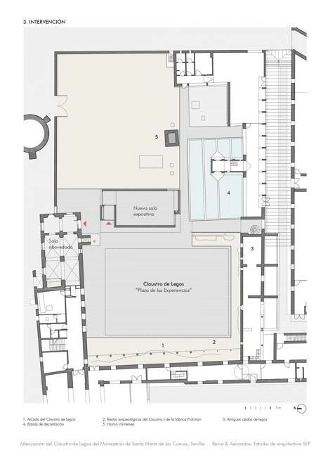 La propuesta se basa en la construcción de un plano unitario de suelo que adquiere formas diversas para contextualizar y enlazar las distintas edificaciones, extendiéndose hacia el patio del claustro para proteger los restos arqueológicos que aún se conservan. Esta nueva plataforma -que se destinará a la celebración actividades culturales- recorta sus límites a una distancia medida de las antiguas celdas de legos y la arquería occidental, liberando una franja donde se muestran los restos de pavimentos originales y otras preexistencias.