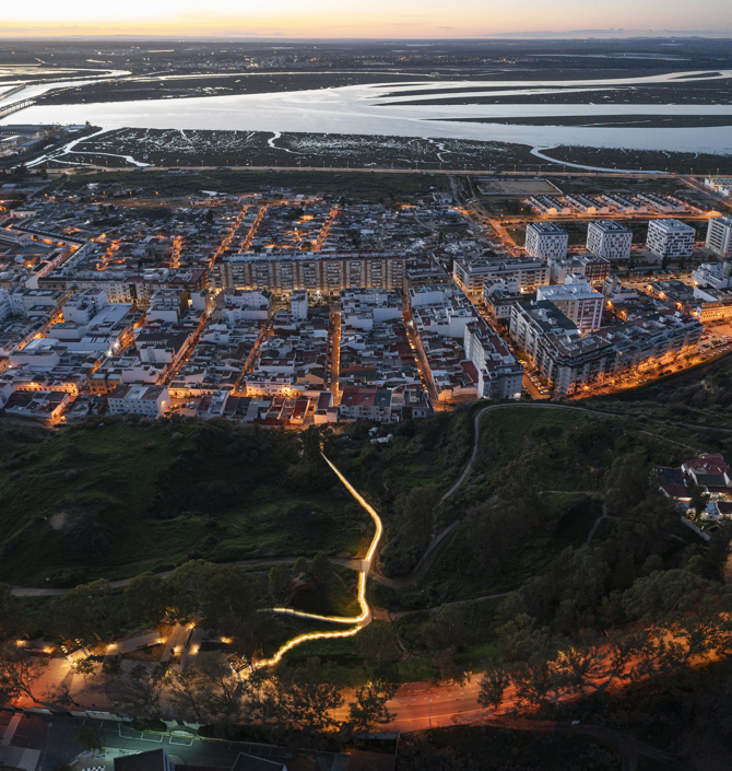 La intervención trata de brindar al ciudadano un lugar para el paseo distendido, la práctica deportiva con el aliciente de la contemplación del maravilloso paisaje de las Marismas del Odiel -Reserva de la Biosfera- que se extiende al Oeste y la información arqueológica y geológica que se aporta mediante señalización y que sirve para que los ciudadanos conozcan mejor el luagar en el que habitan. Para logarlo, no se pretende imponerse a él, sino solo ordenar, mejorar, ampliar y enverdecer los nuevos espacios que se disponen para el peatón y el deportista, a costa de la circulación motorizada y de las ocupaciones incontroladas de los vehículos estacionados.