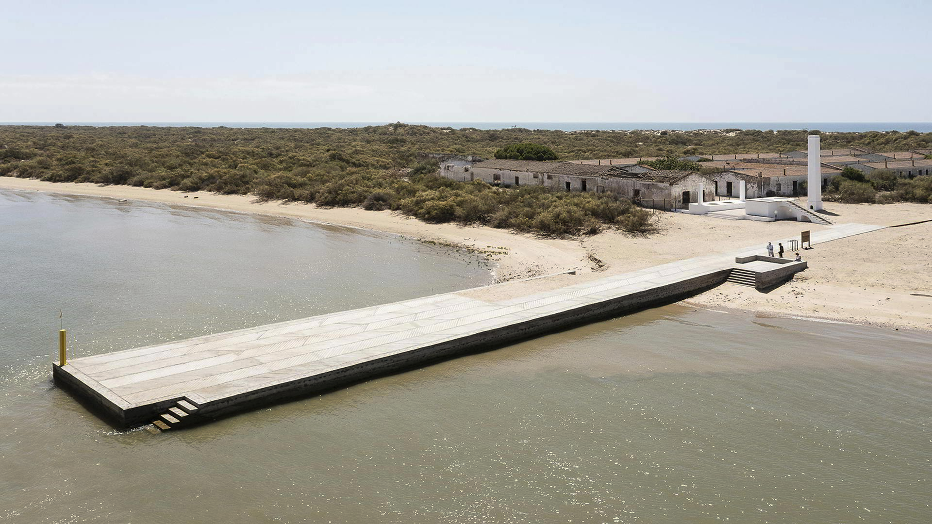 En la desembocadura del río Piedras, un entorno singular y sometido a décadas de explotación productiva, las aguas cercanas al Atlántico fueron testigo de décadas del arte de la pesca de la almadraba. En 2022, María González y Juanjo López de la Cruz ponían fin a una intervención en la Real de la Almadraba de Nueva Umbría, un conjunto de edificaciones industriales abandonadas en los años sesenta. Además del zigzagueo de la senda que conecta el conjunto con las aguas abiertas del Atlántico, el proyecto recuperaba la traza de una vieja caseta y reconstruía el antiguo embarcadero, utilizando sus restos como cimentación.