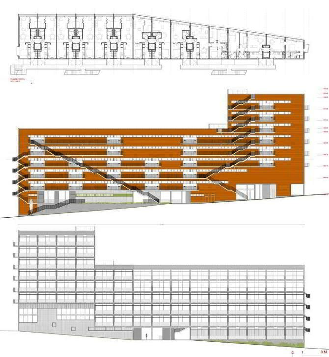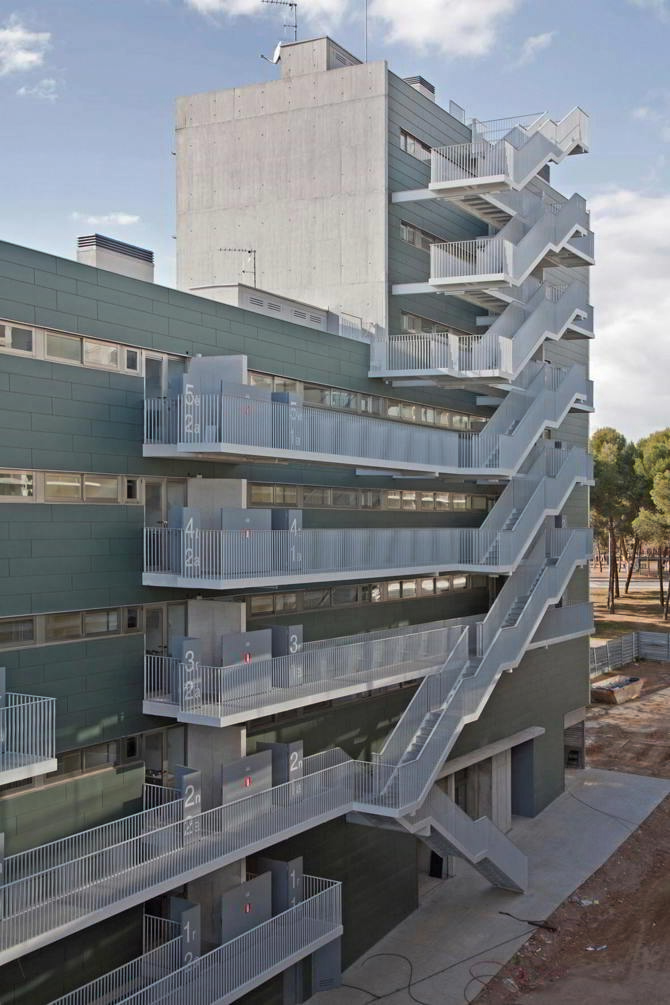 Así, la fachada norte, por el contrario, se distancia de las zonas de circulación protegiéndose de las visiones externas a la vivienda, siendo los elementos de acceso a pie a las viviendas las escaleras y pasarelas, elementos principales de composición de esta fachada.