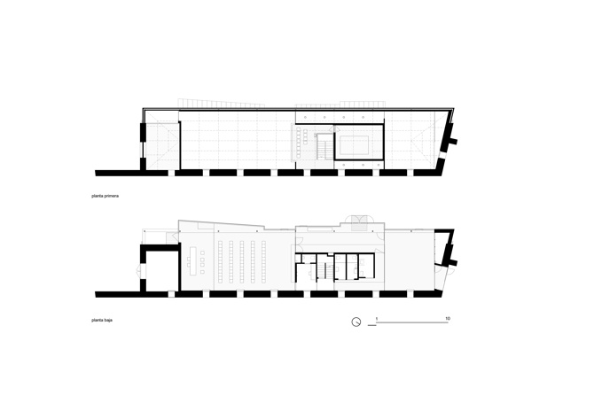 La existencia de una edificación en ruinas y la solicitud por parte del Ayuntamiento de la adecuación de su fachada suponen el punto de partida de este proyecto. Una nave longitudinal con la cubierta hundida, de la que permanecía en buenas condiciones únicamente una fachada de ladrillo, constituye la preexistencia.