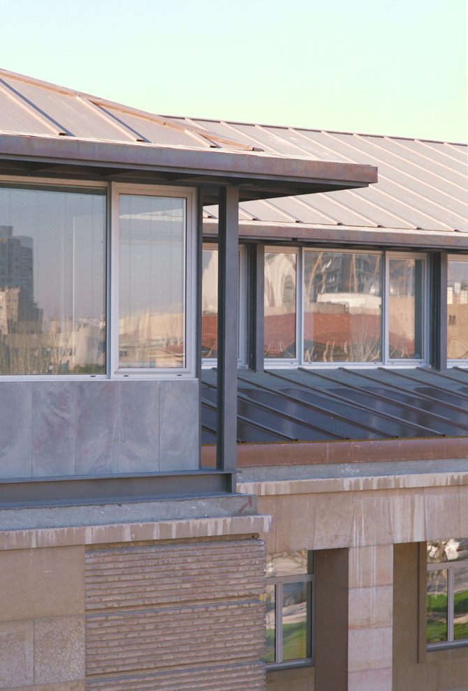 La nueva planta ampliada adquiere la consideración de remate del edificio existente, corrigiendo ligeramente la nueva cubierta de cobre, el trazado de la cubierta de teja primitiva.