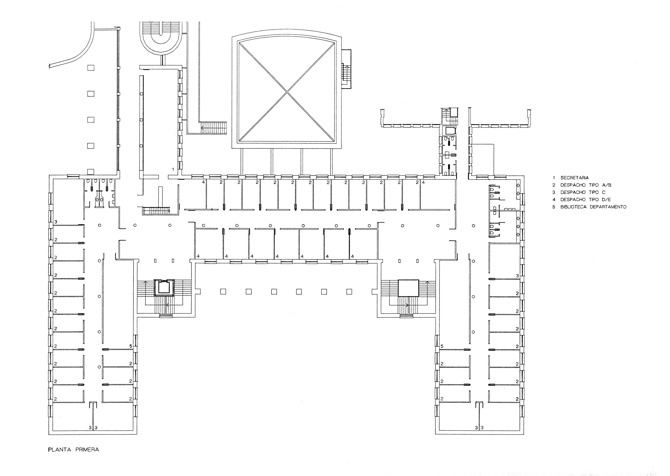 Tras la reforma realizada, la planta baja sigue albergando la zona representativa del edificio: aula magna, decanato, salas de juntas y de grados, pasando la planta primera a ser ocupada en su totalidad por despachos correspondientes a diferentes departamentos. Junto a esto, se ha insertado un nuevo ascensor y se han practicado las conexiones con los restantes edificios que componen la facultad, mejorándose, de este modo, el sistema de circulaciones de las diferentes plantas.