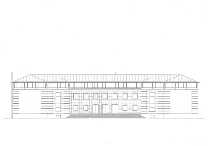 La estructura metálica de soporte, retrasada respecto al pórtico de entrada, se eleva sobre la línea de la imposta existente, persiguiéndose, con la continuidad del cerramiento acristalado, acentuar la ligereza del plano de fachada, delimitado por la horizontal continua del alero.