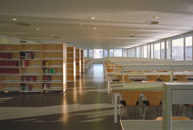 En los años noventa se había planteado, por otra parte, la necesidad de una profunda remodelación interna para dar respuesta a las demandas existentes, concretadas en una ampliación sustancial del número de despachos y en una nueva biblioteca. El proyecto realizado supuso la completa redistribución de las diferentes plantas del edificio existente, el refuerzo de su estructura y cimentación y la modificación de las instalaciones, ampliándolo en una planta, con objeto de ubicar en ella las diferentes dependencias de la biblioteca de la facultad.
