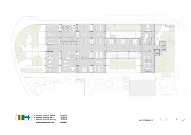 El proyecto aborda la rehabilitación integral de la biblioteca y su nueva ampliación a través de la adición de la tercera nave existente y la construcción de un nuevo cuerpo que, ocupando el patio entre ambos edificios, permite su conexión. El nuevo volumen de estructura metálica se vierte al exterior a través de dos grandes ventanales. El traslado del acceso principal y el nuevo tratamiento del jardín existente en la calle Arquitectura convierten este espacio en una plazoleta que mejora la relación del equipamiento con el espacio público e incrementa la visibilidad. La actuación supone la posibilidad de dar una nueva vida a esta arquitectura de escaso valor patrimonial pero con una considerable carga sentimental para el barrio.