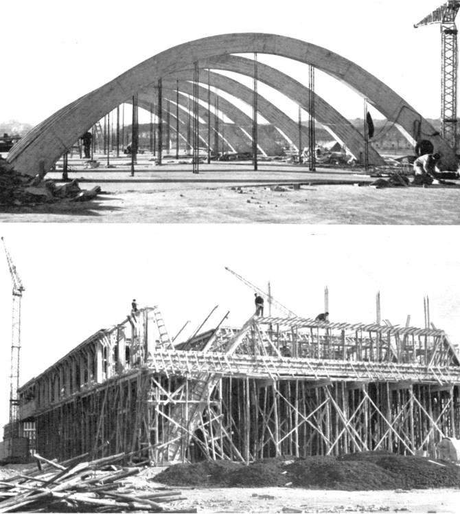 Nave de embotellado: pórticos de hormigón en forma de arcos parabólicos suspenden el forjado de los almacenes con tensores reglables.