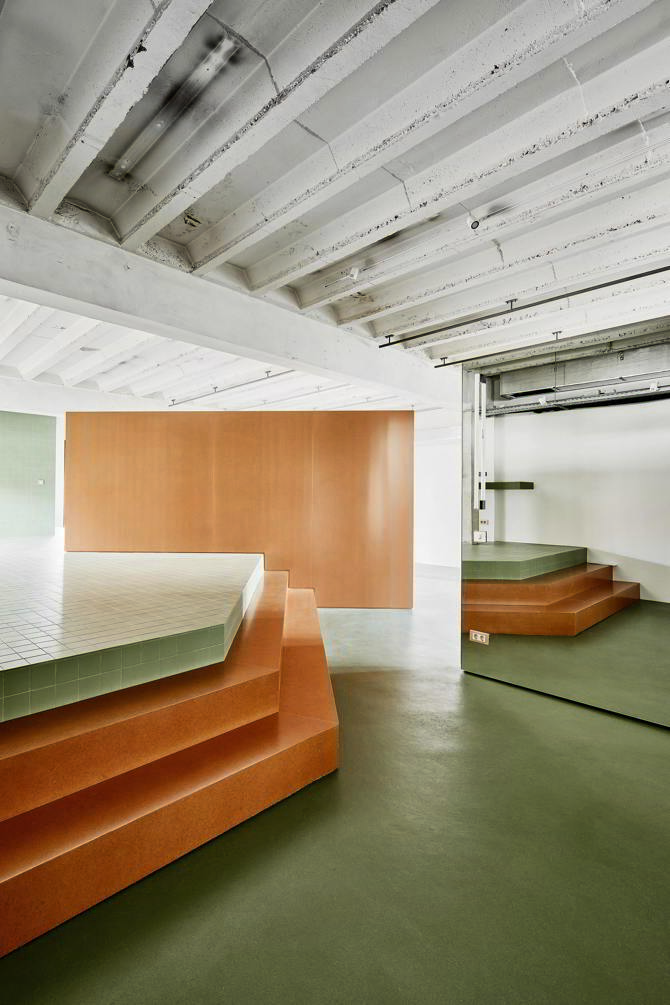 En esta última área, una plataforma elevada crea una atmósfera más recogida y permite integrar la zona de aguas y las instalaciones. Materialmente, el proyecto se reduce a una paleta mínima de dos colores y dos texturas, que refuerza la claridad y la unidad del conjunto.