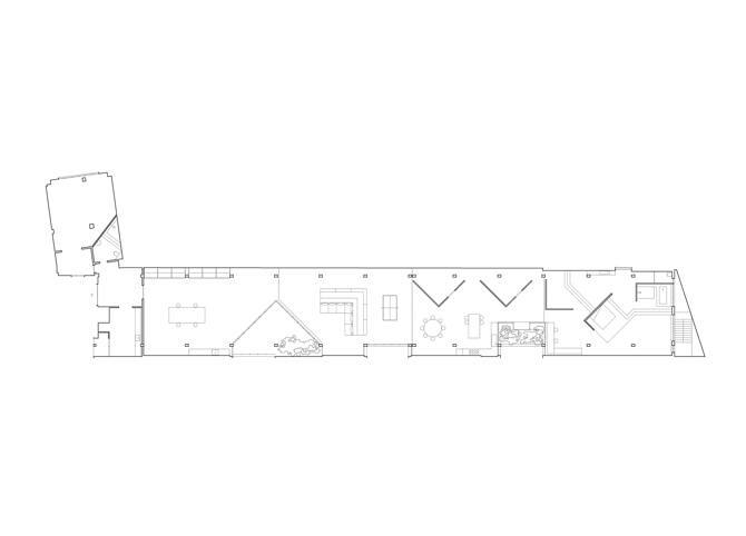 En su lugar, una serie de elementos independientes —planos, diedros y una grada— articulan el espacio sin tocar ni las paredes ni el techo, manteniendo la continuidad visual. Paralelamente, el perímetro se modifica mediante el retranqueo de las carpinterías, generando una terraza triangular y un pequeño jardín que introducen luz, aire y vegetación.