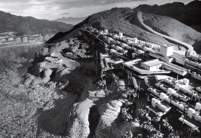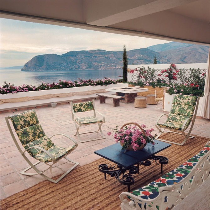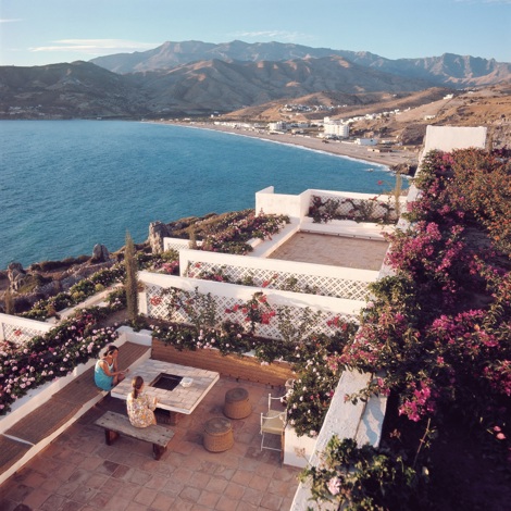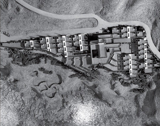 Se accede desde la carretera a la última planta, teniendo que descender a las plantas inferiores. Este trabajo fue utilizado por el Ministerio de Información y Turismo para publicitar España de cara al exterior –fotografía en picado de una de las terrazas del conjunto junto al mar–.