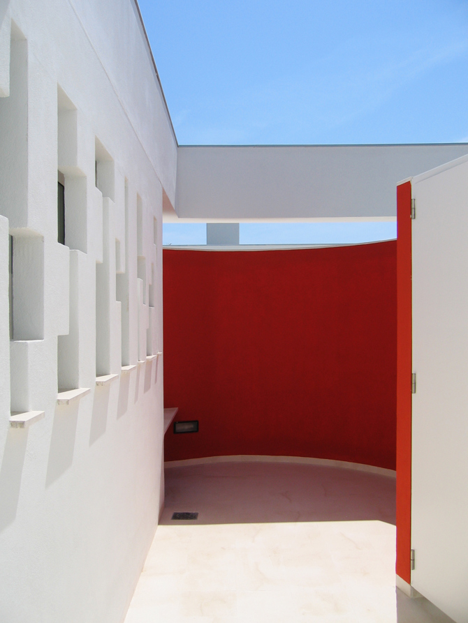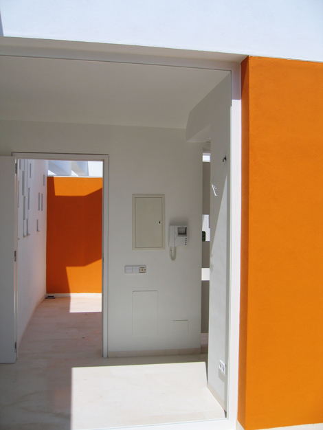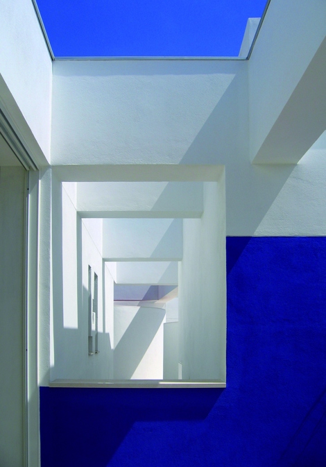 Los patios y las terrazas de cada casa se han pintado con un tono distinto de azul añil, de rojo, o de ocre anaranjado. Para los mismos clientes, construimos seis años antes el edificio contiguo.
