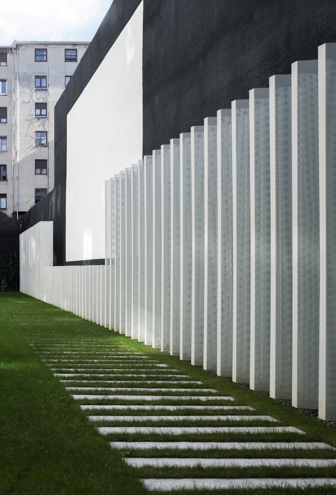 La fachada interior se ha proyectado con un lenguaje que trata de establecer un diálogo formal con el resto de edificios del patio de manzana, sin renunciar al carácter contemporáneo del edificio. Con esta fachada y con el jardín se busca una imagen amable para los usuarios del patio, dignificando una tipología habitualmente poco cuidada en los edificios del ensanche.