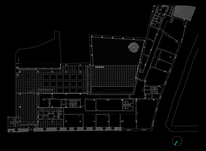 Por último, el patio, jardín privado y extensión visual de las estancias de público y personal, se trata como un lugar central de cuidado carácter, es decir, como un espacio amable y tranquilo por su regularidad y tratamiento, construido como empalizada que dibuja los diferentes bordes, como celosía que limita y oculta la irregularidad de los volúmenes emergentes de su perímetro. Su base, en respuesta al orden de la planta, se fragmenta en dos zonas, la primera pavimentada en continuidad con la sala de investigadores, dilatando la proporción visual de ésta, y la segunda protagonizada por un olivo centenario sobre una cama de grava, de escaso mantenimiento y de aspecto sereno.