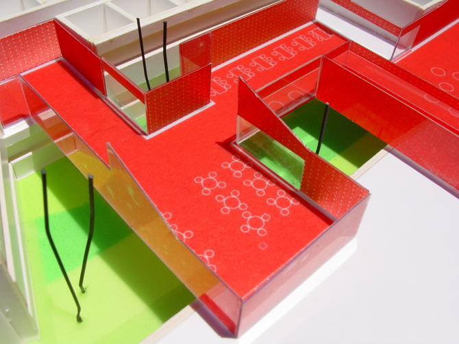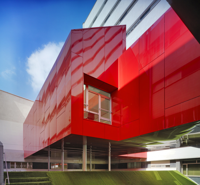 El nuevo volumen, rojo y brillante, funciona al medirse contra sus límites, es elemento ocupado y al mismo tiempo ocupante del vacío, posee una doble lectura de reverso y envés en función del lugar en el que nos encontramos, diferenciando de este modo la cafetería pública de la del personal clínico, y pretende atrapar la atención del usuario desviándola del paisaje circundante.