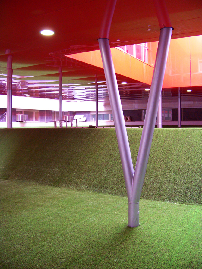 La construcción ligera de estructura de acero y envolvente de aluminio acentúa el carácter de elemento instalado en el vacío hospitalario, al tiempo que, a través de los soportes en “Y”, permite conducir las cargas desde el nuevo volumen, construido como un cajón rígido, a los pilares existentes en la planta sótano donde se halla el ámbito de radiología. Unos apoyos articulados evitan transmitir momentos a la estructura existente, ya que por sus características y su resistencia solo podíamos transmitir axiles.
