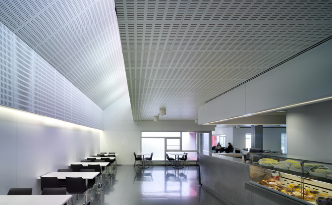 En el interior, se cuida especialmente el confort acústico, rompiendo las superficies del techo con planos inclinados y revistiéndolos con paneles acústicos laminados hasta la cota de dintel de los huecos. Finalmente, el nuevo volumen rompe los límites del patio para alcanzar el vestíbulo general y conectar la cafetería con el Campus Universitario, intentando provocar una cierta rehabilitación emocional a través de la mezcla del mundo universitario con el hospitalario y haciendo de este espacio un lugar de encuentro con la ciudad.