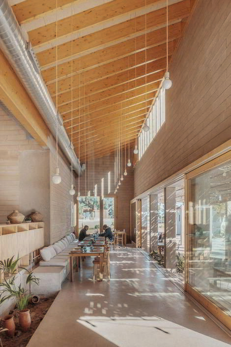 Los edificios comunitarios son el lugar de encuentro entre los habitantes, y por ello se sitúan vinculados a los ejes de circulación y a los espacios equipados de reunión. Alojan aquellos servicios que no pueden ser soportados por los alojamientos itinerantes de los usuarios: comerciales, deportivos, sanitarios. Se construyen como pabellones ligeros con patrones geométricos y modulares, mediante el uso de sistemas de construcción tradicionales del lugar, y con una importante experimentación plástica y material. Es una arquitectura de pocos recursos y basada en la economía de medios, que pone el acento en los espacios intermedios como estrategia de vínculo con el lugar: porches, patios y pérgolas.