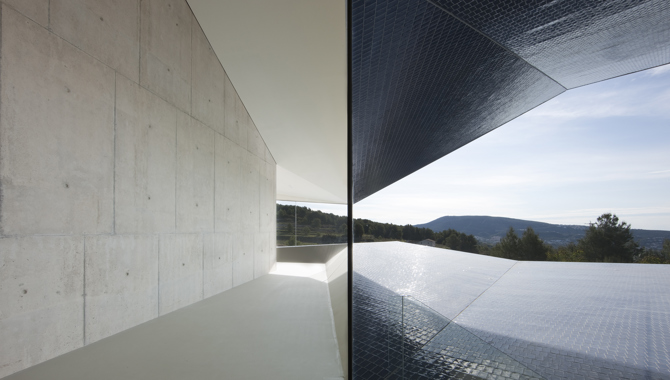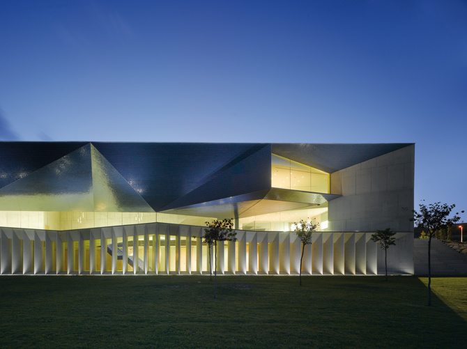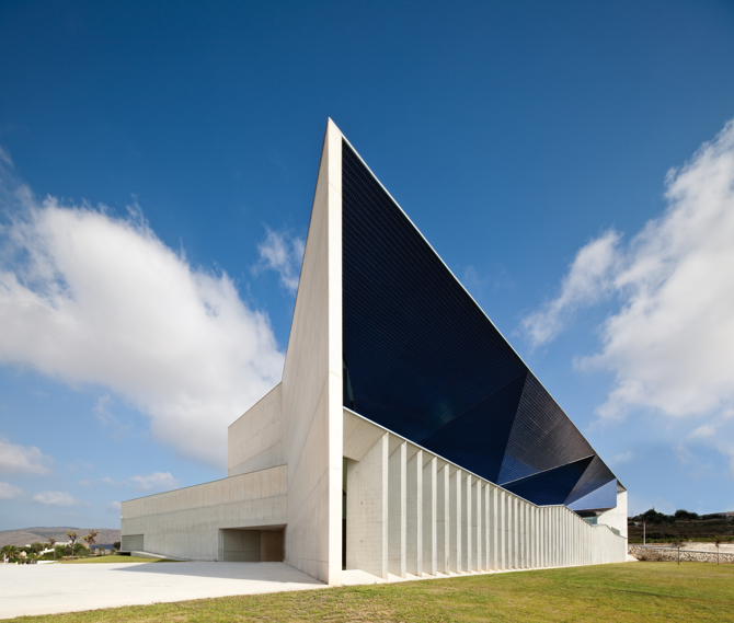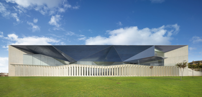 En términos metafóricos esta fachada recrea una topografía asimilable a una playa pétrea que, desde la distancia, y con su profundidad, permite leerse fundida con el mar. En términos más prácticos su geometría profunda y quebrada nace del estudio de la incidencia solar y de la geometría por ella generada, especialmente en verano, y su configuración final tiene como objetivo que nunca los rayos del sol incidan de manera directa en el interior.