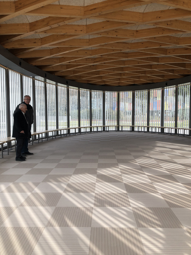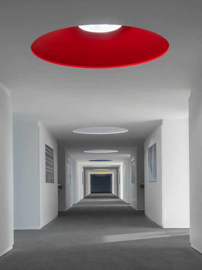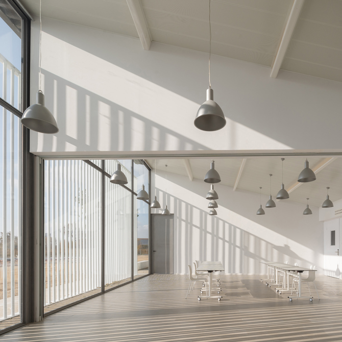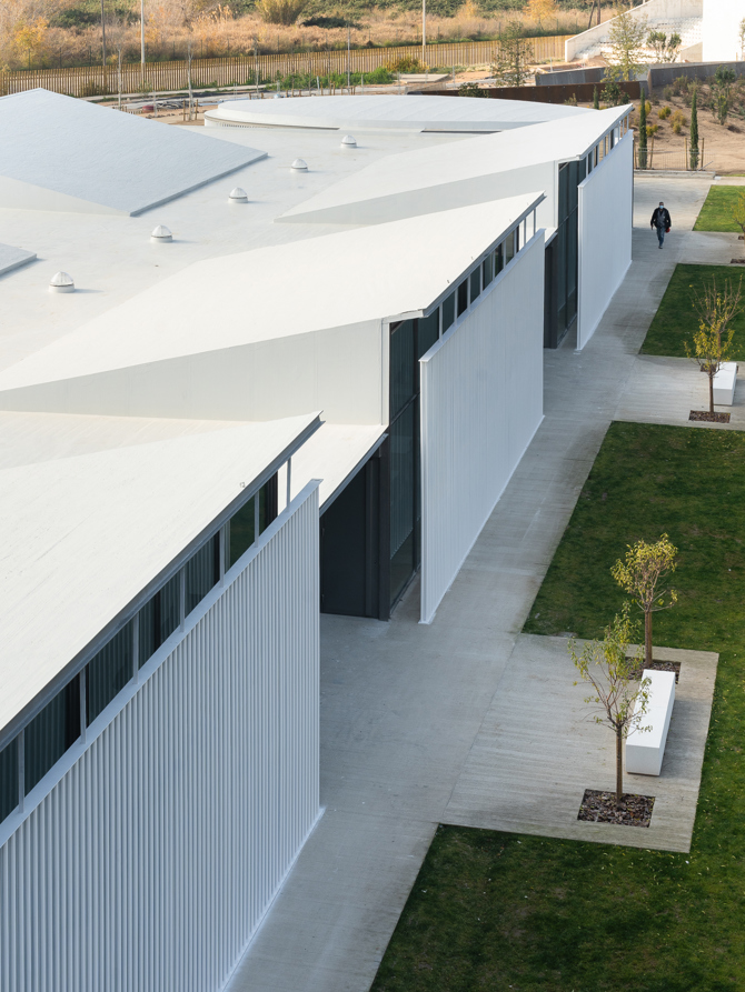 Entre estos nuevos equipamientos y ya finalizada su construcción, presentamos el nuevo aulario y el espacio destinado a encuentros y debates. Un ágora elíptica, como aquella que trazó Hipatia de Alejandría en el siglo V, como lugar geométrico en el que la suma de las distancias de cada punto a los focos se mantiene siempre constante. Así, nace un lugar para la formación y el debate. El aulario se relaciona con los demás edificios del conjunto conformando un claustro jardín mediterráneo, flanqueado por un parque del agua que mostrará el recorrido hídrico del Bajo Llobregat hasta el mar, con lo que se complementarán los equipamientos iniciales, un conjunto al servicio de las personas y en especial de los niños.