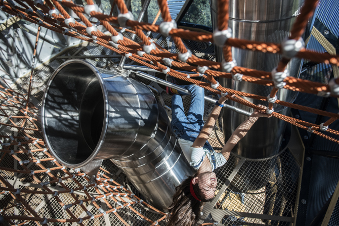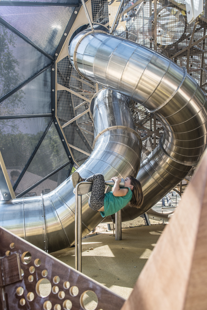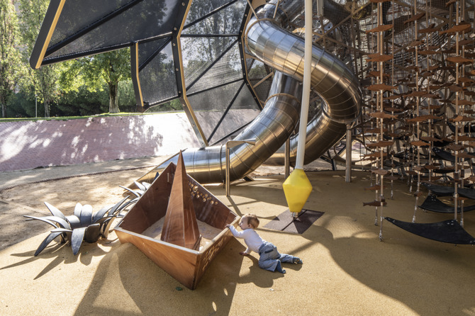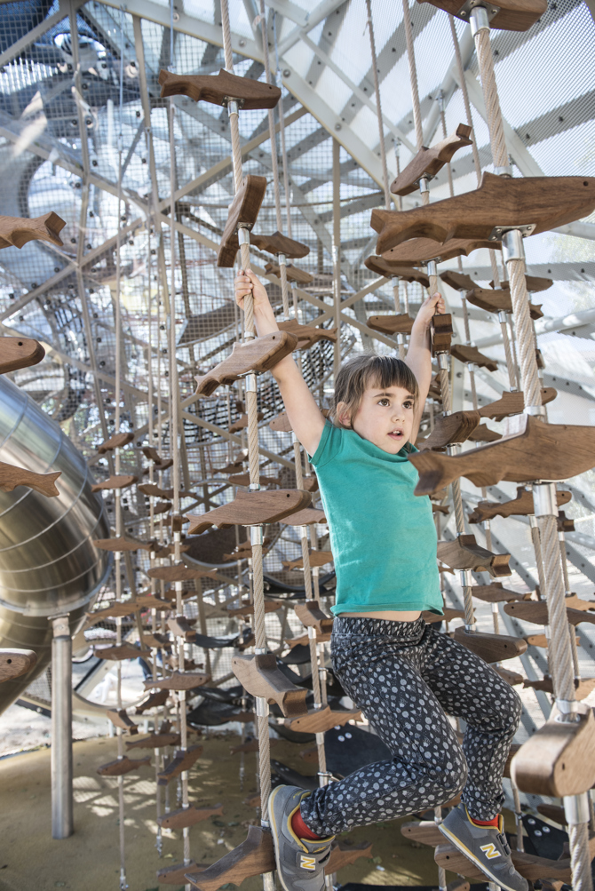 Visible desde la calle, el juego se convierte en un foco de atracción, un hito urbano que dinamiza el espacio público y moviliza los usos y las acciones de sus usuarios. La potencia estratégica del monumento jugable propicia el desarrollo de una narrativa que redefine el lugar facilitando la apropiación de los niños y sus familias.