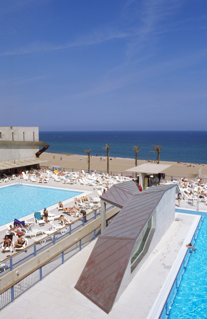 Todas las aguas de las pequeñas piscinas de los clubs que ocupaban la playa de la Barceloneta se han agrupado en un nuevo edificio y repartido en tres piscinas, una de ellas cubierta y con gradería. El conjunto construido en tres etapas ocupa los terrenos de los antiguos Baños de San Sebastián, demolidos por ruinosos.